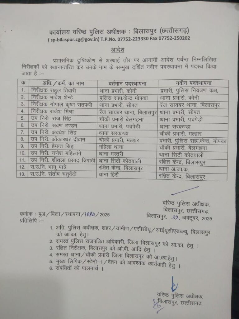 वरिष्ठ पुलिस अधीक्षक बिलासपुर द्वारा जारी आदेश को पुलिस विभाग में एक “इमेज क्लीनिंग एक्सरसाइज” के रूप में देखा जा रहा है। इस आदेश में कई थाना प्रभारियों और उप निरीक्षकों के तबादले भी शामिल हैं।