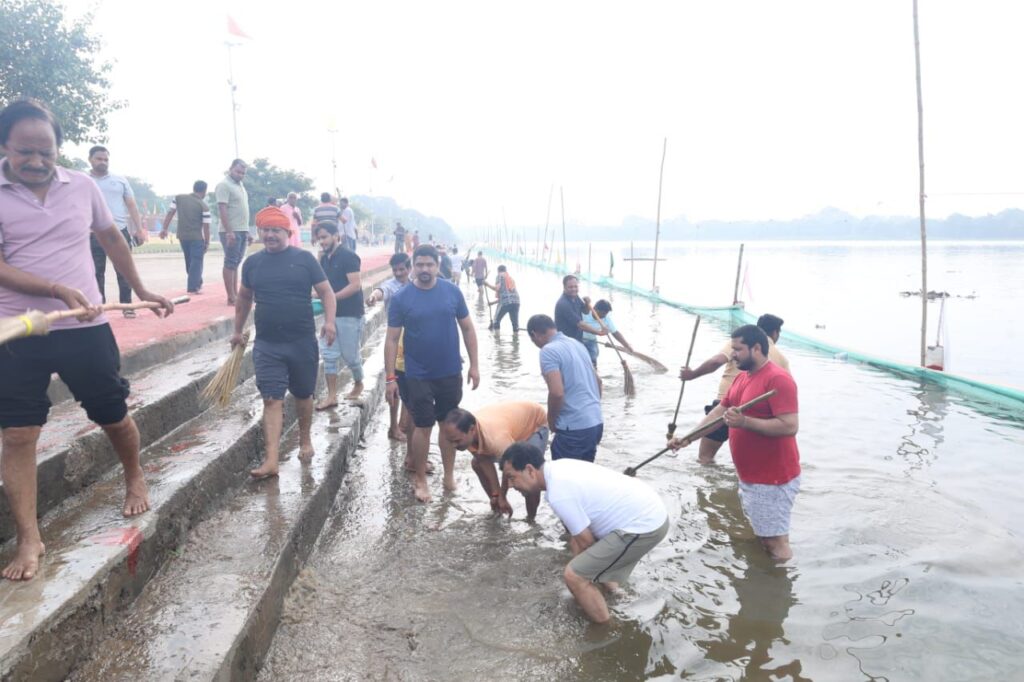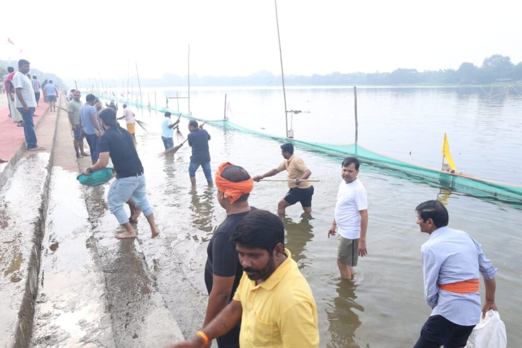 बिलासपुर के तोरवा स्थित अरपा नदी पर बना एशिया का सबसे लंबा स्थाई छठ घाट पर श्रमदान करने के लिए सुबह 7 बजे स्वयंसेवकों की उमड़ी भीड़।