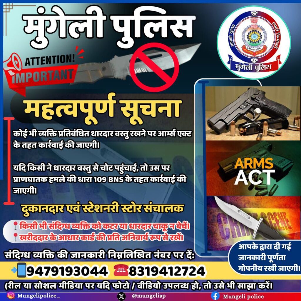 मुंगेली जिले में कानून-व्यवस्था और आमजन की सुरक्षा को ध्यान में रखते हुए पुलिस अधीक्षक भोजराम पटेल (भा.पु.से.) के निर्देश पर मुंगेली पुलिस ने एक महत्वपूर्ण पहल की है। इसके तहत शहर और ग्रामीण क्षेत्रों में धारदार प्रतिबंधित वस्तुओं की बिक्री व रख-रखाव पर सख्त निगरानी शुरू कर दी गई है।
