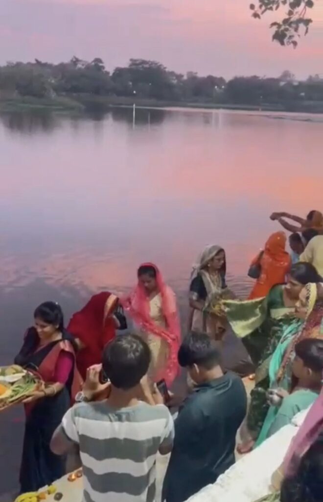 सजे हुए सुंदर घाट और व्यापक इंतजामों के साथ हजारों की भीड़ में टिकरापारा के नरैया तालाब में भी हजारों छठ व्रतियों ने संध्या अर्घ्य दिया।