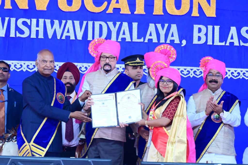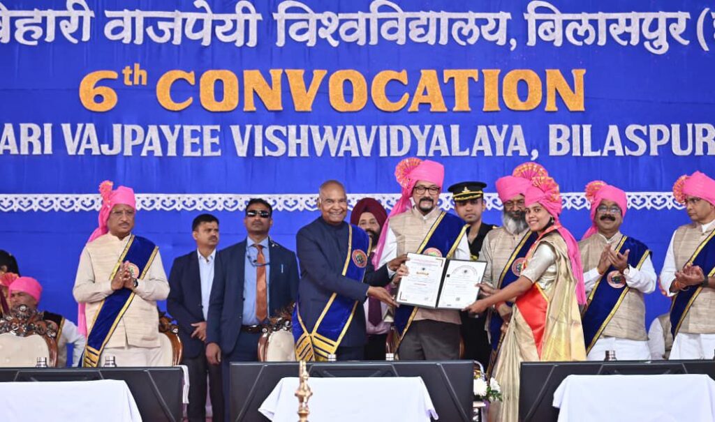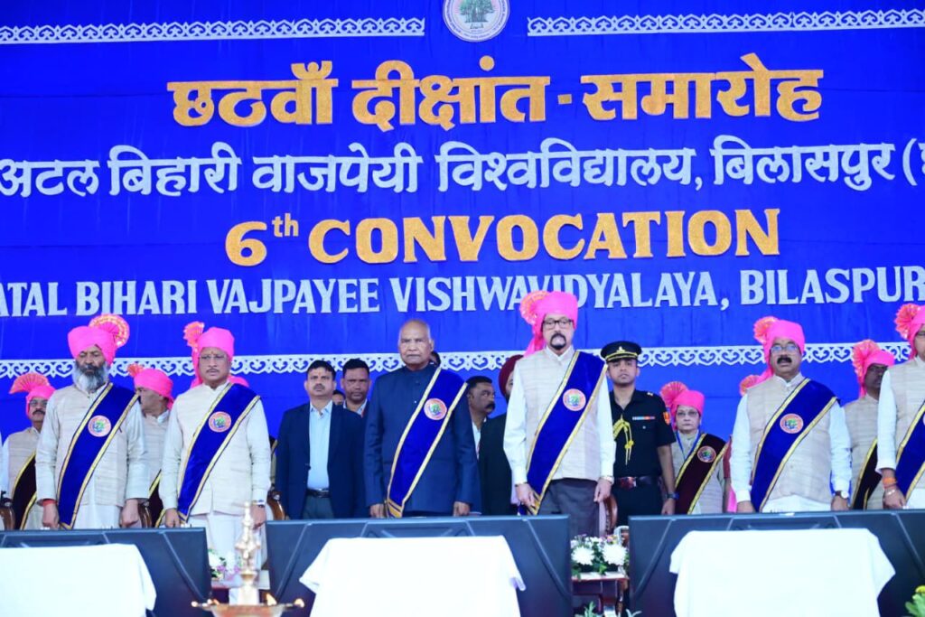 बिलासपुर-[जनहित न्यूज] अटल बिहारी वाजपेयी विश्वविद्यालय के छठवें दीक्षांत समारोह का आयोजन आज पूर्व राष्ट्रपति रामनाथ कोविंद के मुख्य आतिथ्य में गरिमामय वातावरण में किया गया। कार्यक्रम की अध्यक्षता राज्यपाल रमेन डेका ने की। अति विशिष्ट अतिथि के तौर पर मुख्यमंत्री विष्णु देव साय, विशिष्ट अतिथि उपमुख्यमंत्री अरुण साव तथा उच्च शिक्षा मंत्री टंकराम वर्मा शामिल हुए। कार्यक्रम में विश्वविद्यालय के कुलपति