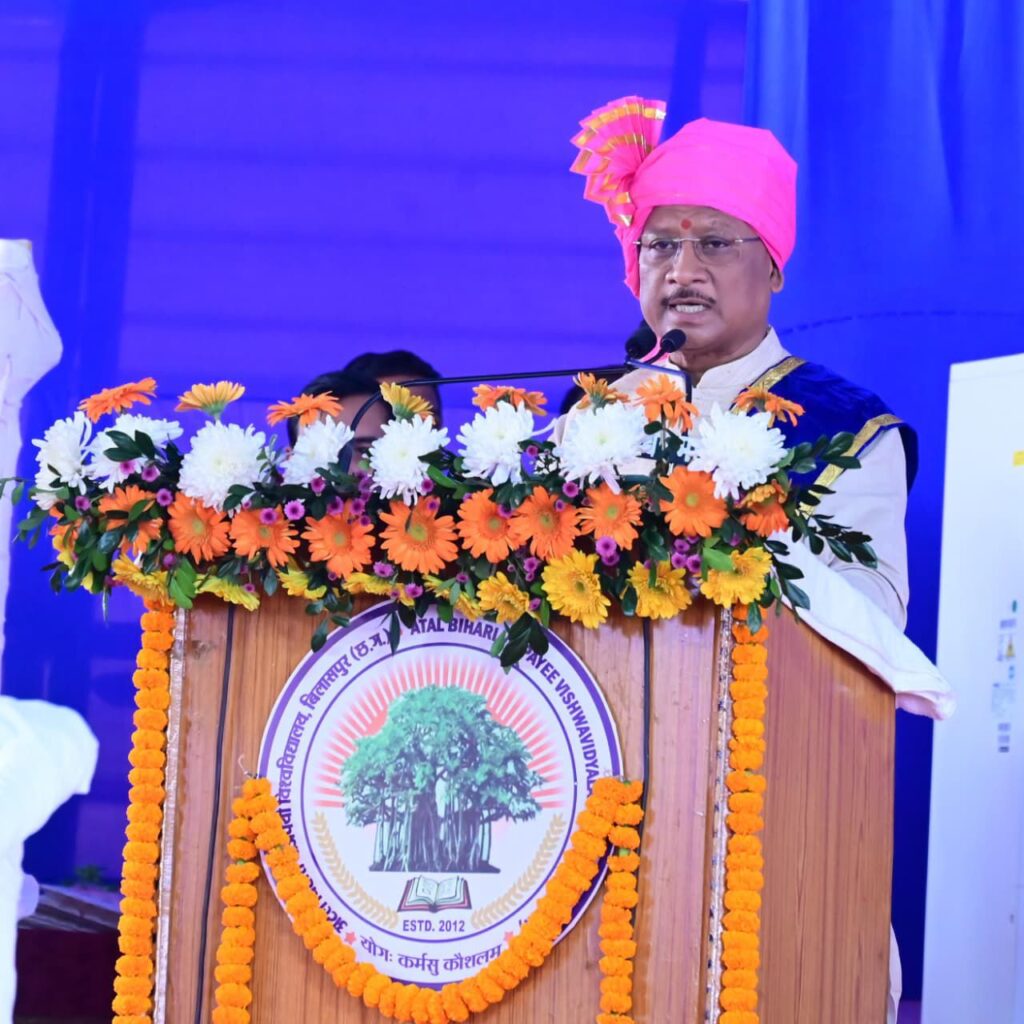 कार्यक्रम के अति विशिष्ट अतिथि मुख्यमंत्री विष्णु देव साय ने अपने उद्बोधन में विद्यार्थियों को उनकी उपलब्धियों के लिए बधाई दी और उन्हें जीवन में नैतिकता, समर्पण और समाजोपयोगी योगदान की प्रेरणा दी। मुख्यमंत्री ने कहा कि यह समारोह केवल औपचारिक आयोजन नहीं है, बल्कि विद्यार्थियों के सपनों, संकल्पों और संघर्षों का उत्सव है। उन्होंने विश्वविद्यालय द्वारा राष्ट्रीय शिक्षा नीति 2020 के अनुरूप बहुविषयक अध्ययन, कौशल आधारित शिक्षण, चार वर्षीय स्नातक कार्यक्रम, अकादमिक बैंक ऑफ क्रेडिट और आधुनिक पाठ्यचर्या जैसी व्यवस्थाओं को लागू करने की सराहना की, जिससे छात्र वैश्विक अवसरों का लाभ उठा सकें। मुख्यमंत्री ने कहा कि विवि में डिजिटलईजेशन के माध्यम से विश्वविद्यालय द्वारा प्रवेश प्रक्रिया, परीक्षा फॉर्म, ट्रांसक्रिप्ट और डिग्री प्रमाणपत्र जैसी सेवाओं को ऑनलाइन उपलब्ध कराया गया है।