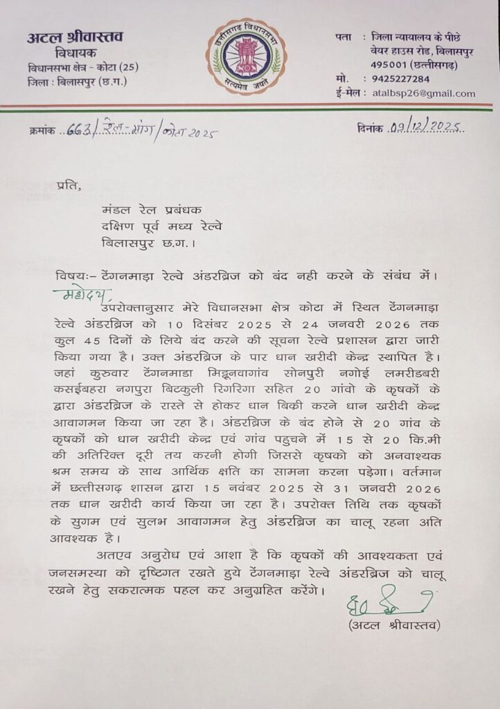 कोटा विधायक अटल श्रीवास्तव को क्षेत्र भ्रमण में किसानों द्वारा जानकारी दी गई कि रेलवे प्रशासन द्वारा टेंगनमाडा अंडरब्रिज को 10 दिसम्बर से 45 दिनों के लिए बंद किया जा रहा है। अटल श्रीवास्तव ने डीआरएम को टेंगनमाडा अंडरब्रिज को बंद नहीं करने की मांग करते हुए पत्र लिखते हुए कहा कि टेंगनमाडा अंडरब्रिज से कुरुवार, टेंगनमाडा, मिट्ठूनवागांव, सोनपुरी, ढ़ोल मौहा, नागोई, लमरी डबरी, कसईबहरा, नगपुरा, बिटकुली, रिगरीगा सहित लगभग 20 गावों के कृषक धान बेचने धान खरीदी केंद्र आवागमन करते है।