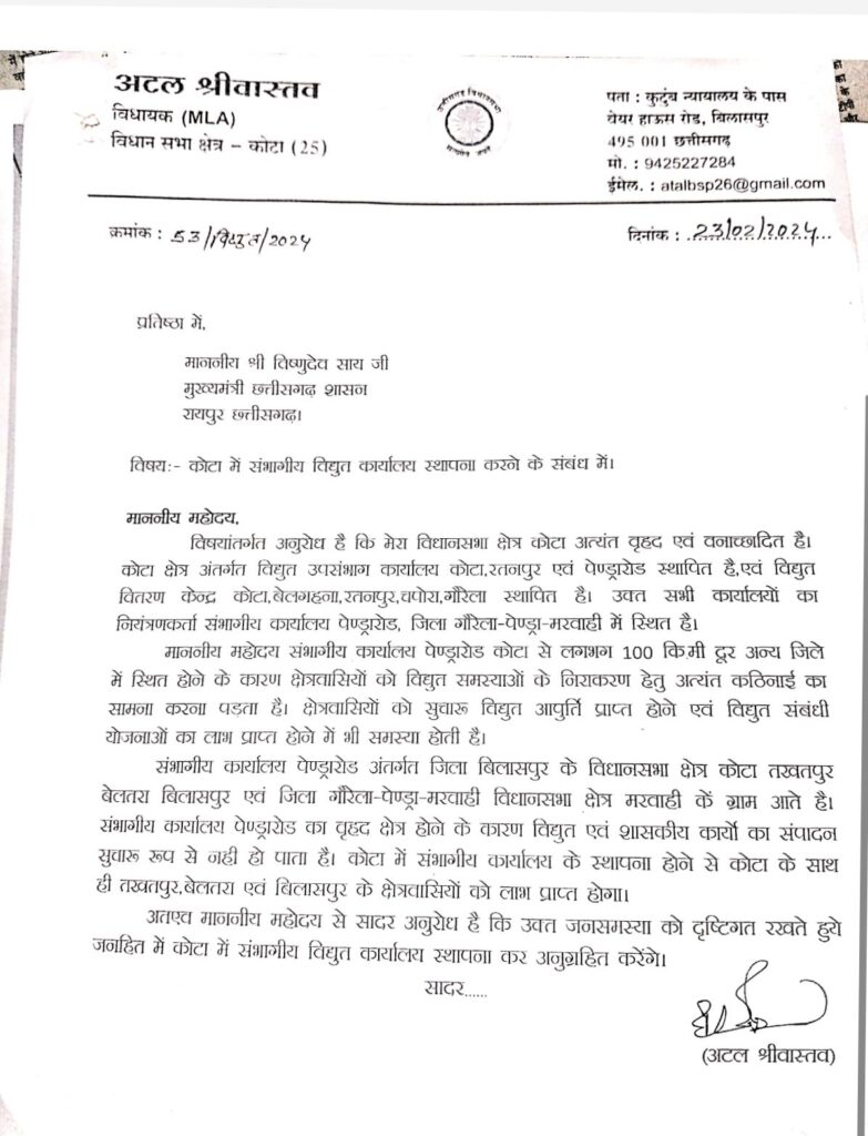 बिलासपुर-[जनहित न्यूज] कोटा विधायक अटल श्रीवास्तव ने विधानसभा एवं मुख्यमंत्री को पत्र लिखकर पेण्ड्रा डिवीजन से कोटा सब डिवीजन रतनपुर सब डिवीजन को अलग कर नया डिवीजन आफिस स्थापित करने की मांग की थी कोटा के 1 लाख विद्युत उपभोक्ताओ को होगा लाभ बिलासपुर छत्तीसगढ़ स्टेट पॉवर डिस्टीब्यूशन कंपनी लिमिटेड द्वारा पत्र द्वारा विधायक अटल श्रीवास्तव को जानकारी प्रदान की गई है कि आपके मांग पर विचार करते हुए कोटा सब डिवीजन रतनपुर सब डिवीजन के 11 वितरण केन्द्रो को जोड़कर सकरी नया विद्युत डिवीजन कार्यालय बनाये जाने की स्वीकृति दी गई है। सकरी डिवीजन में रतनपुर कोटा के साथ सकरी और तखतपुर सब डिवीजन भी शामिल रहेगा। कोटा विधायक अटल श्रीवास्तव ने मुख्यमंत्री का आभार व्यक्त किया है कि कोटा के उपभोक्ताओं की मांग को आपने स्वीकृत किया गौरतलब है कि अटल श्रीवास्तव ने मुख्यमंत्री विष्णुदेव साय सचिव छत्तीसगढ़ शासन ऊर्जा विभाग एवं कार्यपालक निदेशक छत्तीसगढ़ स्टेट पॉवर डिस्टीब्यूशन कंपनी को लगातार पत्र व्यवहार करते रहे विधायक अटल श्रीवास्तव ने विधानसभा में भी कोट क्षेत्रवासियों के सुगमता एवं आवश्यकता को ध्यान रखते हुए कोटा के आस-पास संभागीय कार्यालय स्थापना करने कि मांग की थी। अटल श्रीवास्तव ने पत्र में उल्लेख किया था कि कोटा अत्यंत वृहद वानांचल एवं आदिवासी क्षेत्र है कोटा बेलगहना रतनपुर चपोरा को पेण्ड्रा रोड डिवीजन कार्यालय से जोड़कर रखा गया है। क्षेत्रवासियों को विद्युत संबंधी समस्याओ एवं कार्यो हेतु 100 कि.मी. दूर पेण्ड्रा जाना पड़ता है। पेण्ड्रा संभागीय कार्यालय जीपीएम जिले के अंतर्गत आता था दूरी की वजह एवं दूसरा जिला होने के कारण उपभोक्ताओं एवं जनप्रतिनिधियों को विद्युत संबंधी समस्या हेतु संवाद स्थापित करने में परेशानी होती थी। विधायक अटल श्रीवास्तव ने बताया कि सकरी में संभागीय विद्युत कार्यालय के स्थापना से कोटा रतनपुर बेलगहना चपोरा सहित तखतपुर बिलासपुर के लाखो उपभोक्ताओं को सीधा लाभ मिलेगा कोटा विधानसभा की बहुत पुरानी एवं आवश्यक मांग थी जिसे अब पूरा किया गया।