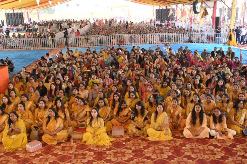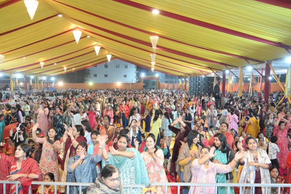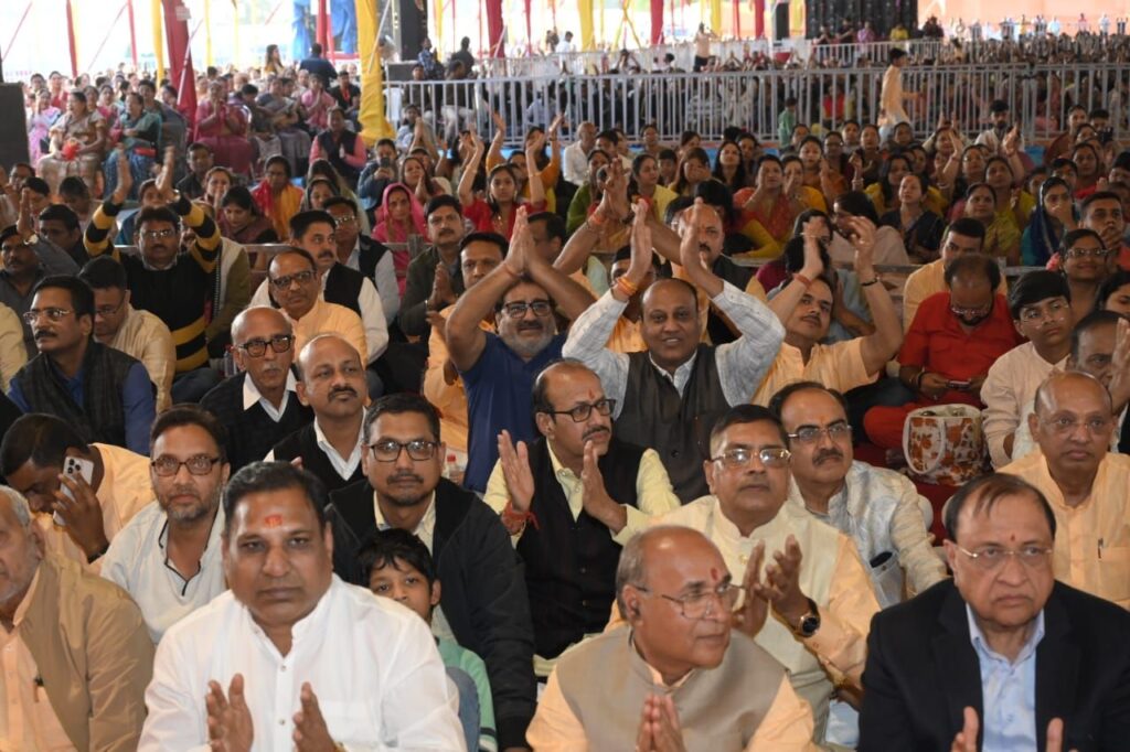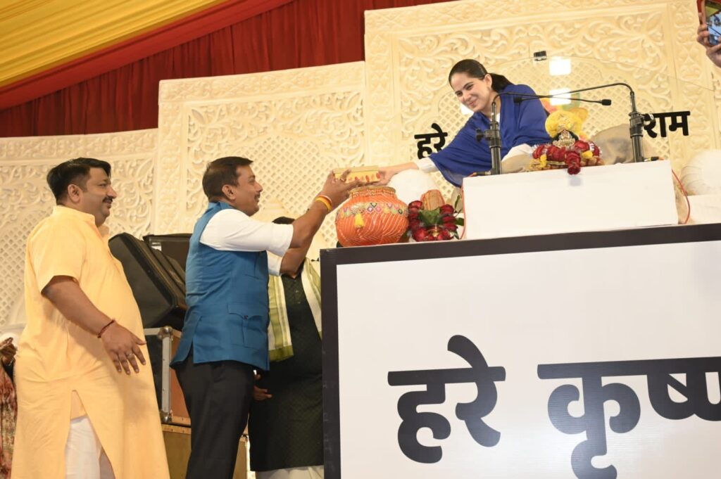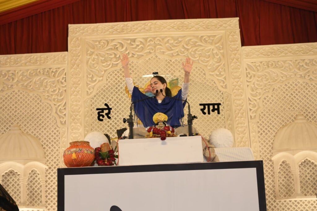 जया किशोरी ने नानी बाई के मायरो की कथा का प्रारंभ करते हुए नरसिंह जी के बचपन की कथा सुनाई। जन्म से गूंगे-बहरे नरसिंह जी को एक संत के आशीर्वाद से वाणी प्राप्त हुई और वे “राधे-कृष्ण” का नाम लेने लगे।