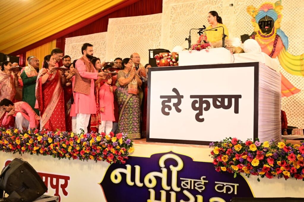 उन्होंने कहा कि नानी बाई का मायरो कथा में जो श्रद्धालु आपके साथ बैठे हैं बगल मेंदिक्कत में शायद वही काम आएंगे। उन्होंने कहा कि नरसिंह मेहता ने अपनी बेटी को पहली बार देखा। और जब नानी बाई के ससुराल से मायरा भरने के लिए बुलावा आता है तो नरसिंह जी मेहता भगवान को याद करने लगते हैं। भगवान श्री कृष्णा को याद करते हैं और भगवान रुक्मणी देवी को आते हैं कि वे नानी बाई की हमारा भरने जा रहे हैं। रुक्मणी भी तैयार हो जाती है। और मायरा का सामान लेने बाजार पहुंचे। भगवान रुक्मणी देवी को समझाते हैं की नानी बाई के यहां सास ससुर का सम्मान करना है।