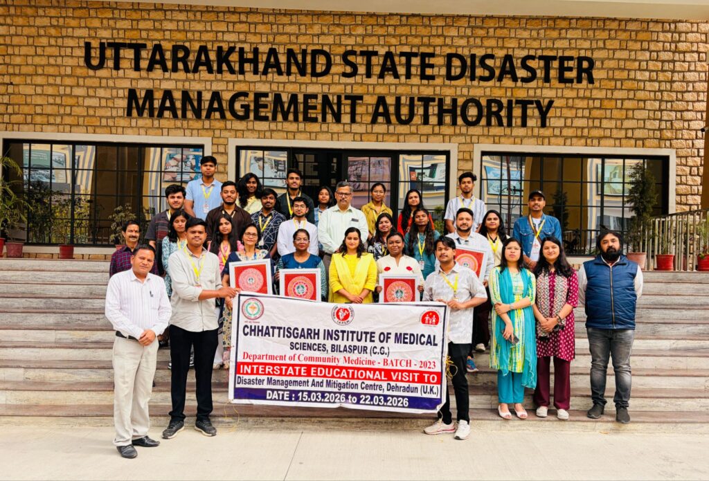 बिलासपुर छत्तीसगढ़ आयुर्विज्ञान संस्थान (सिम्स) के कम्युनिटी मेडिसिन विभाग द्वारा विद्यार्थियों को प्राकृतिक आपदाओं से बचाव, राहत एवं पुनर्वास कार्यों की व्यवहारिक जानकारी देने के उद्देश्य से उत्तराखंड राज्य आपदा प्रबंधन प्राधिकरण, देहरादून स्थित डिजास्टर मैनेजमेंट एंड मिटिगेशन सेंटर (DMMC) में एक सप्ताह का शैक्षणिक भ्रमण आयोजित किया गया।
